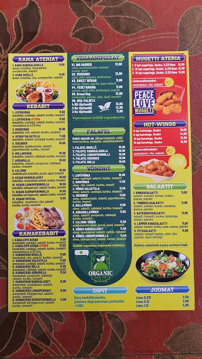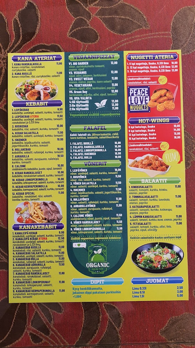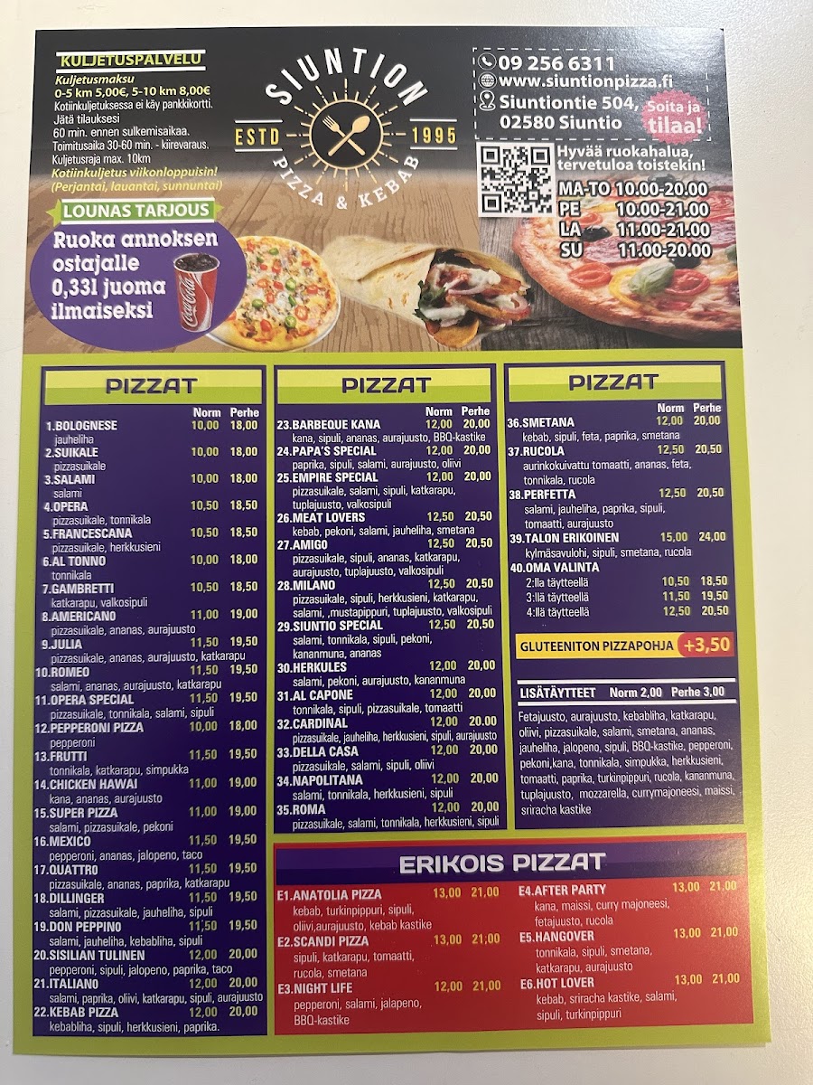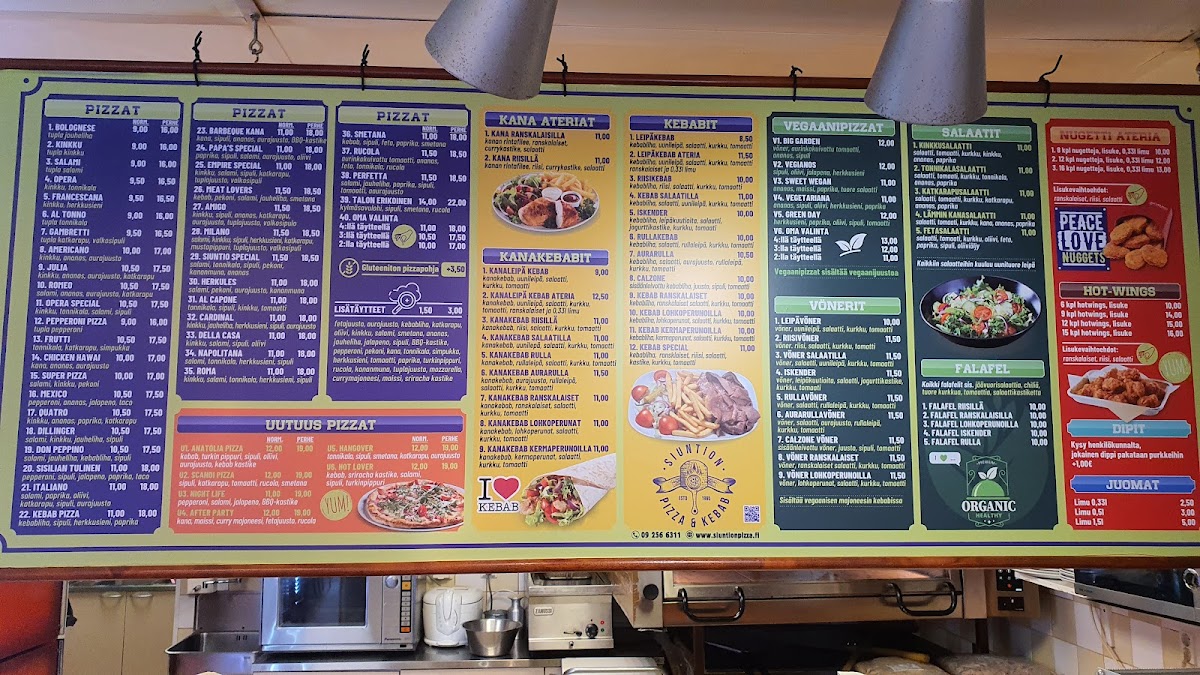 The menu at Siuntion Pizzeria Ja Kebab offers a delightful mix of hearty and flavorful options, with a clear focus on satisfying both pizza lovers and kebab enthusiasts. Among the standout dishes is the Meat Lovers Pizza, which is perfect for those who enjoy a variety of meats layered over a cheesy pizza base. Another popular choice is the Perhe Pizza Pepperoni Jalapeno Bacon Chicken, a bold combination of spicy jalapenos, savory pepperoni, crispy bacon, and juicy chicken, providing a burst of flavors in every bite. For those who crave something a little different, the Special Calzone is a must-try, with its stuffed pockets filled with delicious ingredients that are sure to please any palate.