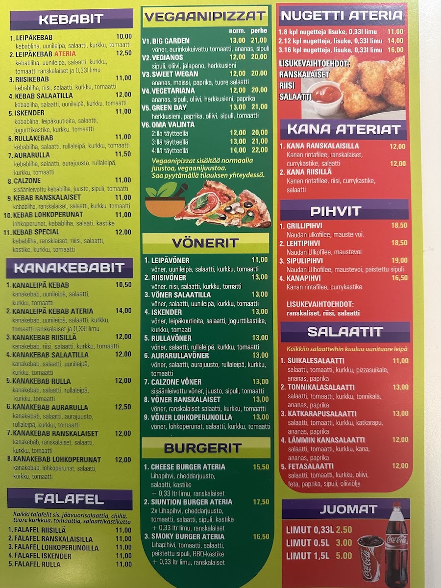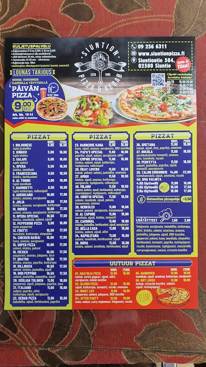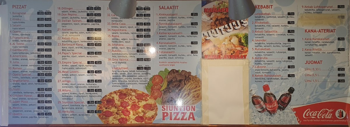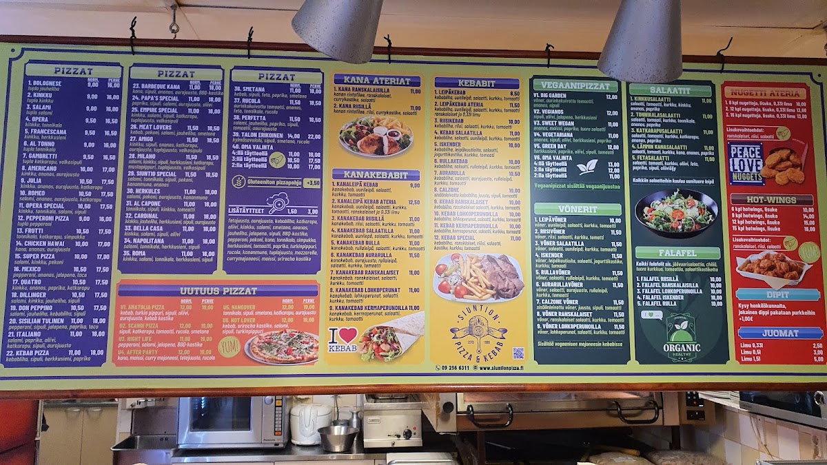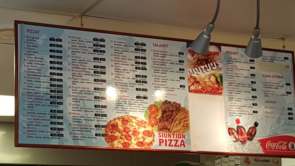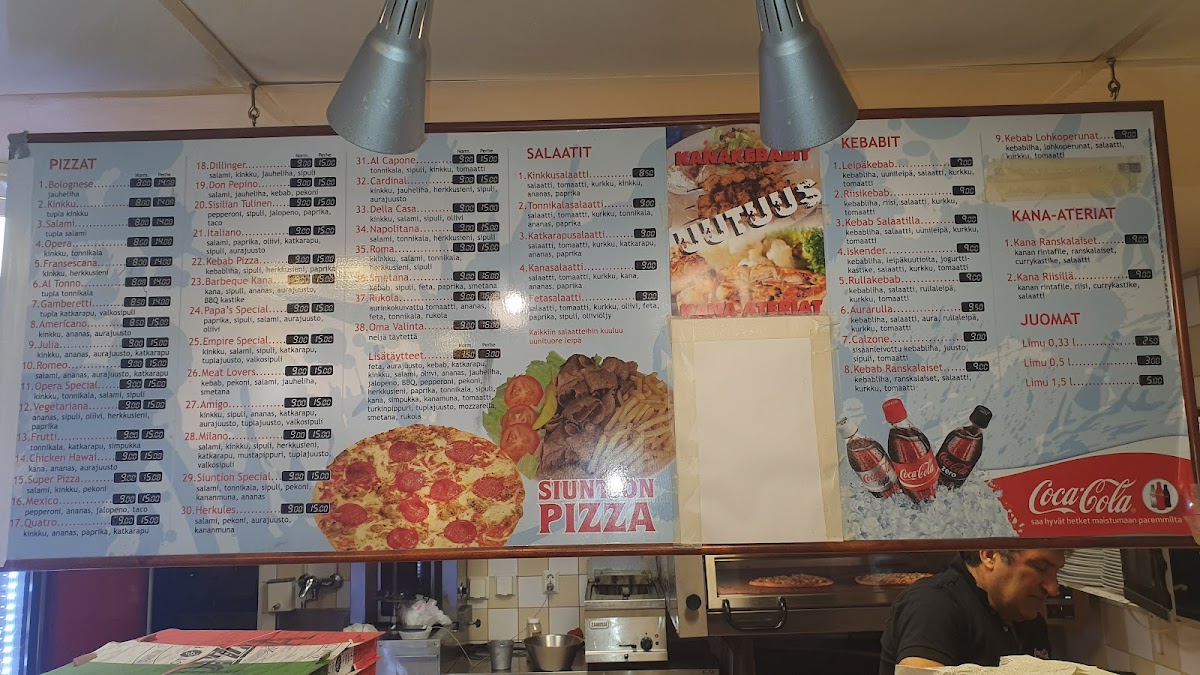 If you’re in the mood for something more filling, the Kebab Ranskalaiset Kebab with Fries is an excellent option. This dish offers tender, seasoned kebab meat served alongside crispy fries, making for a satisfying and indulgent meal. Each dish on the menu promises high-quality ingredients and generous portions, ensuring that diners leave fully satisfied. Whether you're craving a pizza packed with toppings or a flavorful kebab dish, Siuntion Pizzeria Ja Kebab delivers a satisfying experience.